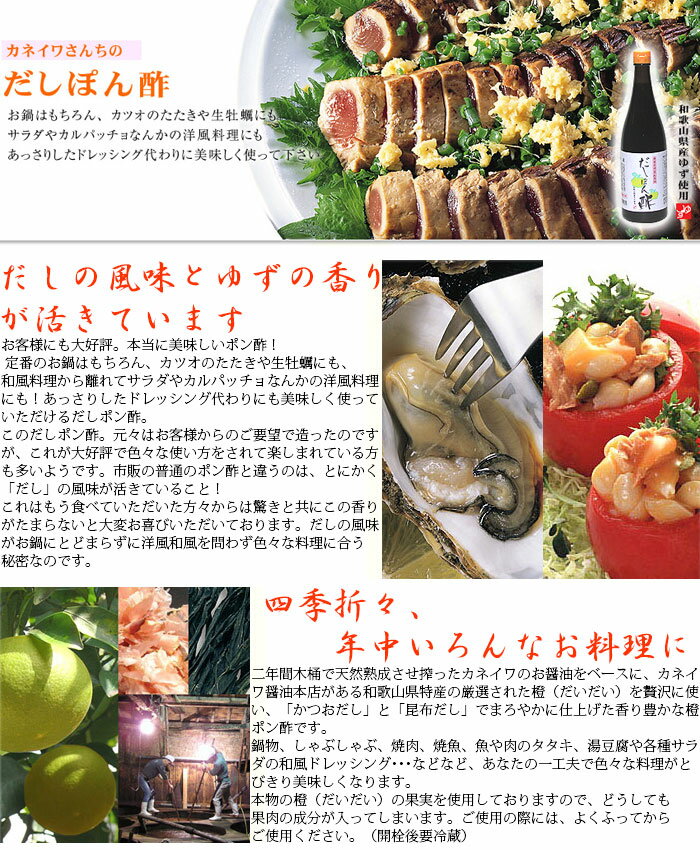 サイズバリエーション(画像をクリックで各サイズへ移動します) だしぽん酢 150ml だしぽん酢 300ml だしぽん酢 720ml こちらのページは【かね岩醤油本店 だしぽん酢 720ml】の販売ページです